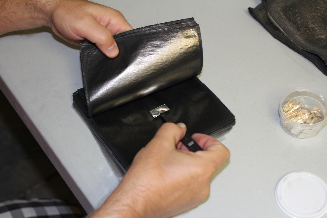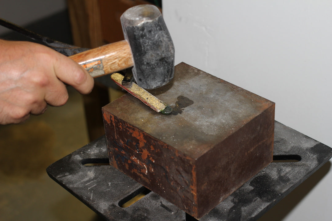 After the stack is completed, it is inserted into a pouch so as to maintain form during the beating process. A mechanical hammer is used to beat the metals thinner, and thinner.