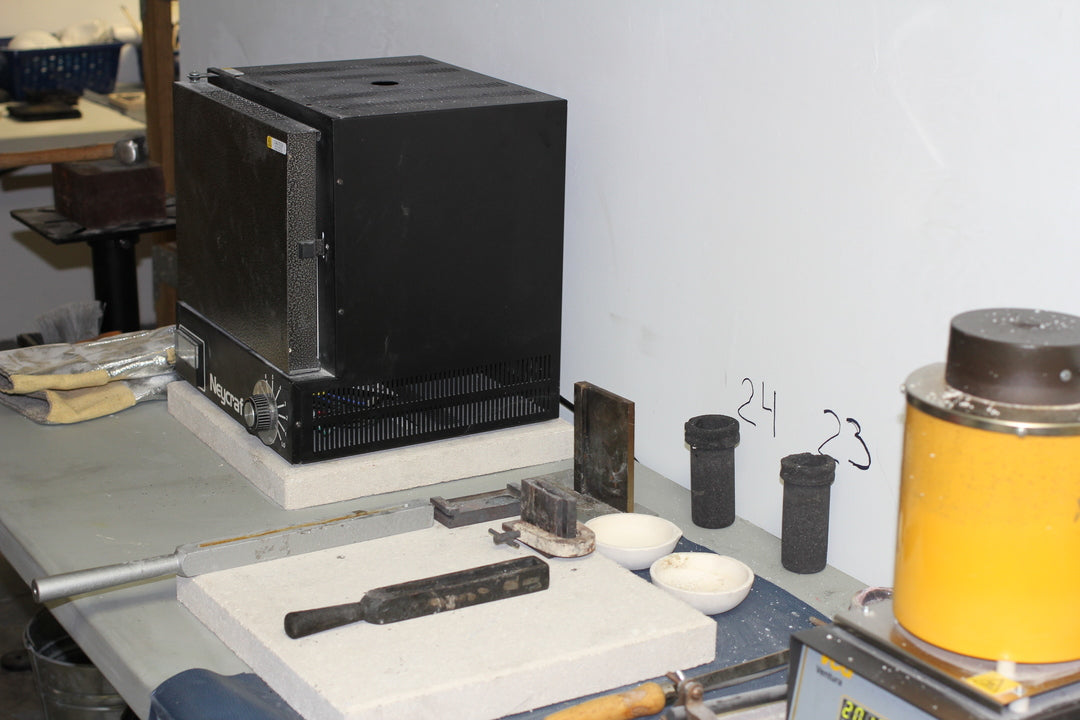 All of the tools necessary are prepared for the melting process. These are standard pieces of equipment used for melting precious metals.