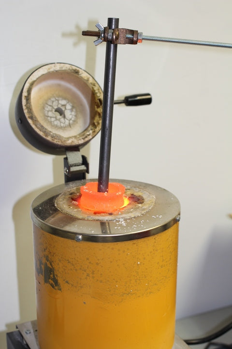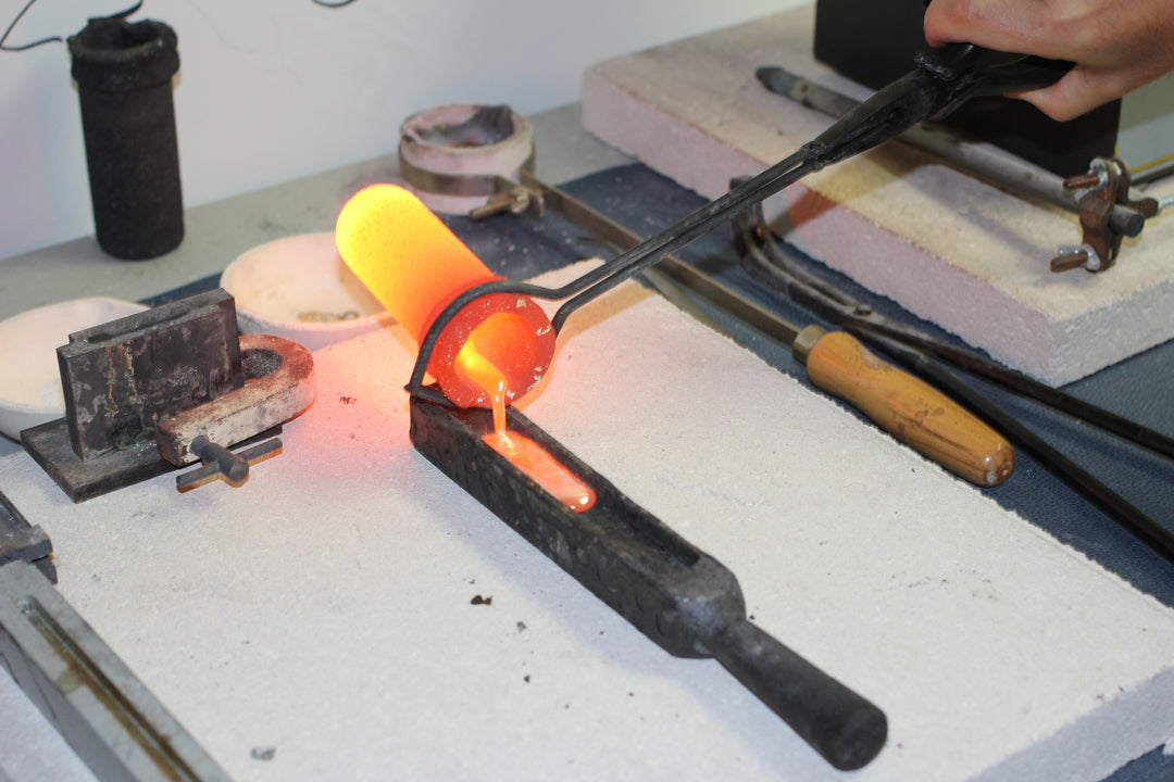 We insert the raw gold or silver into an oven, where they are melted at their respective melting temperatures. They are inserted inside a crucible that glows bright orange from the intense heat. This is what allows us to insert and remove the melted gold and silver metals.