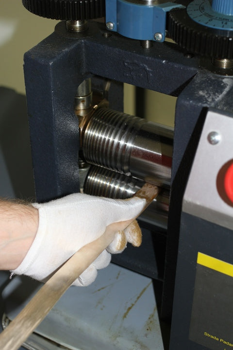 The bar is rolled through a machine that reduces the bar's thickness, stretching the gold into a spool. This process is repeated until the bar has reached a consistent thickness that can be processed further.