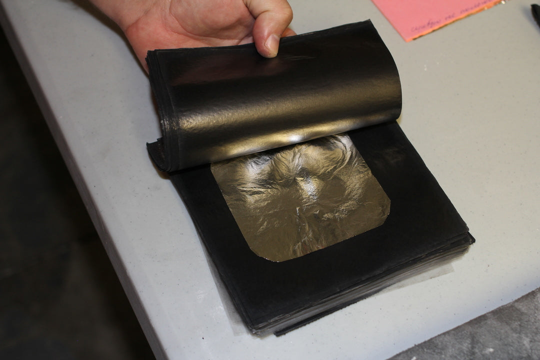 After the first hammering is completed, the gold or silver squares of 1 inch have now grown to roughly four times their original size, and much thinner.